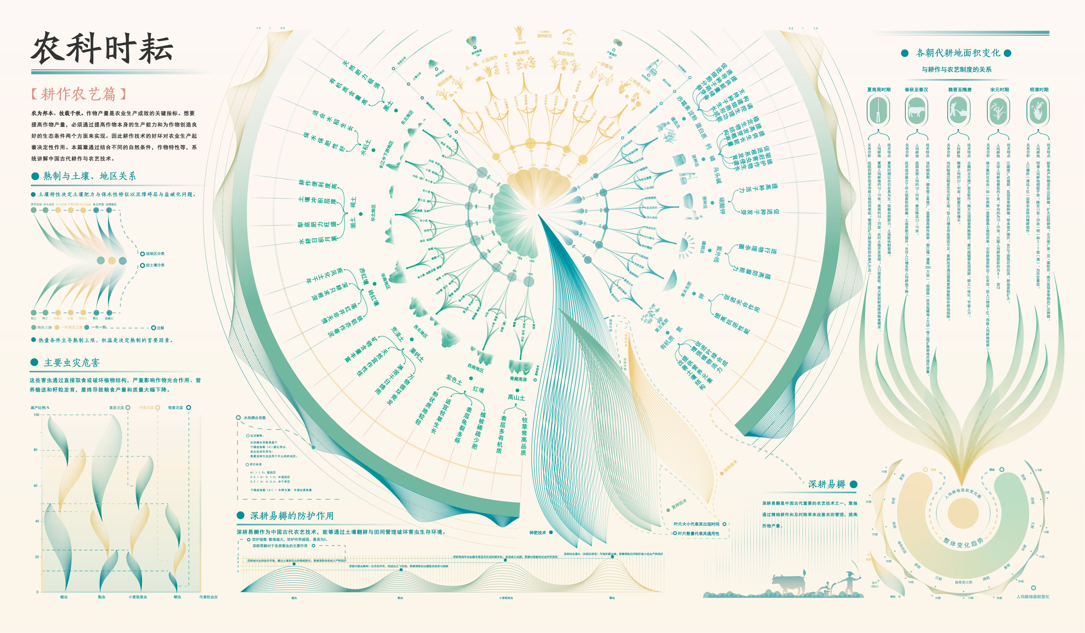 信息可视化作品《农科时耘》,用可视化的视觉效果将中国古代农业文明从“农耕技术”,“农具发展”,“水利兴农”、“思想著作”、“传播交流”的不同角度进行科普展示,让千年农业智慧可感、可触、可传播,彰显学科融合与文化传承价值。