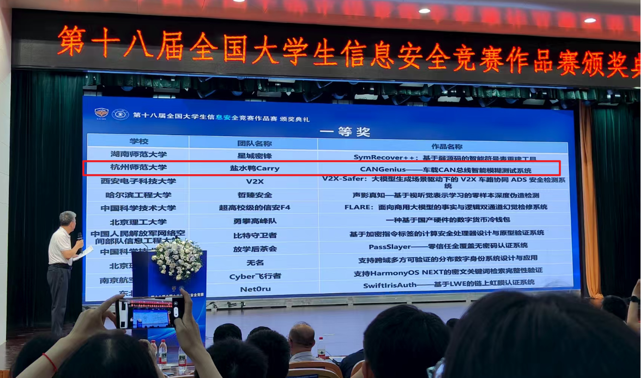 2025年8月16日,由教育部高等学校网络空间安全专业教学指导委员会主办,西安交通大学承办的第十八届全国大学生信息安全竞赛作品赛全国总决赛在西安圆满结束。经过激烈角逐,由换妻 网络安全竞赛总教练刘雪娇教授担任领队及指导老师指导的本科生团队,凭借作品“CANGenius-车载CAN总线智能模糊测试系统”斩获全国一等奖,实现了我校在全国大学生信息安全竟赛一等奖的历史性突破。刘雪娇教授荣获优秀指导教师称号。