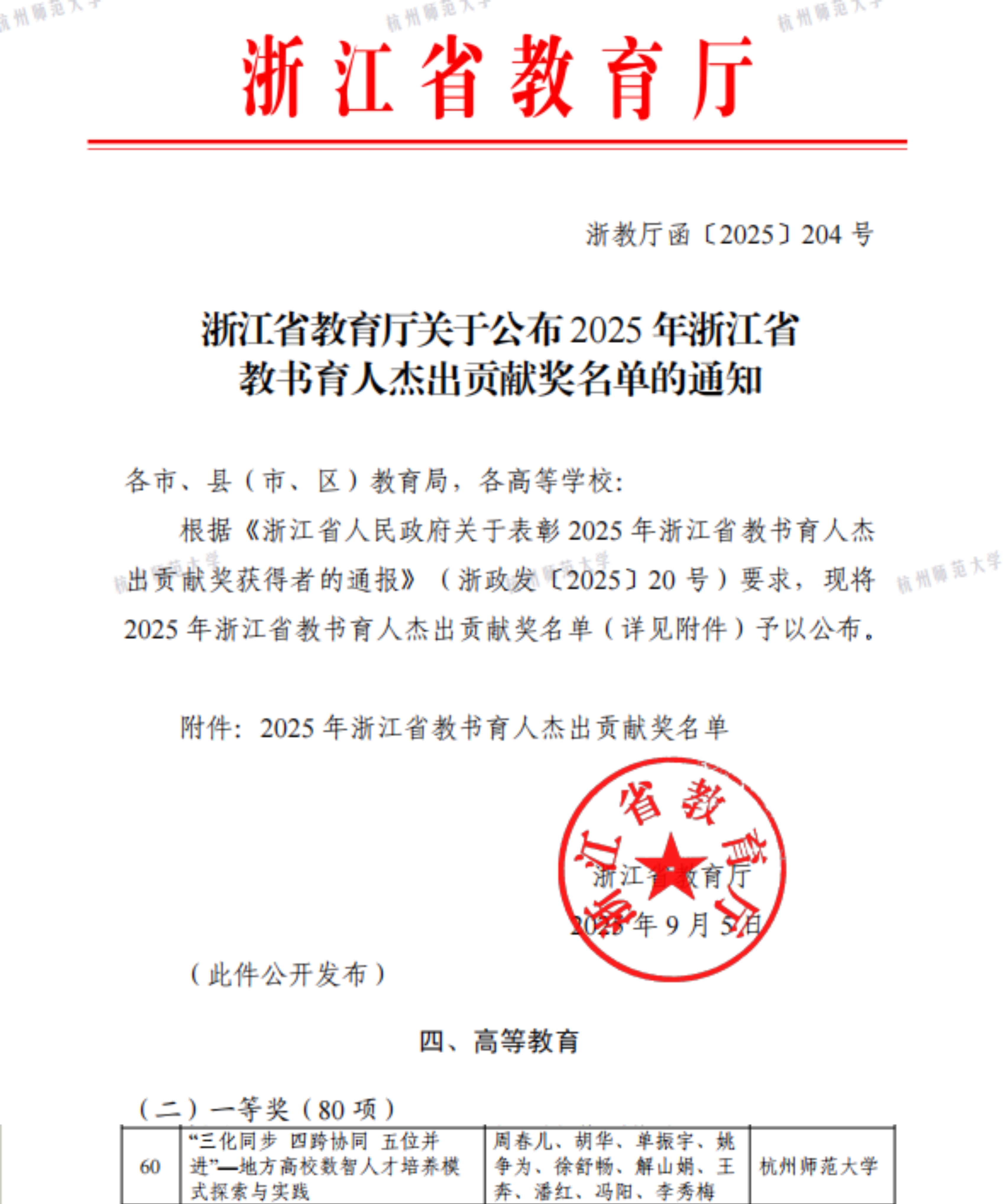 欣闻喜讯,振奋人心!在刚刚公布的2025年浙江省教书育人杰出贡献奖评选结果中,我院荣获浙江省教学成果(高等教育)一等奖!