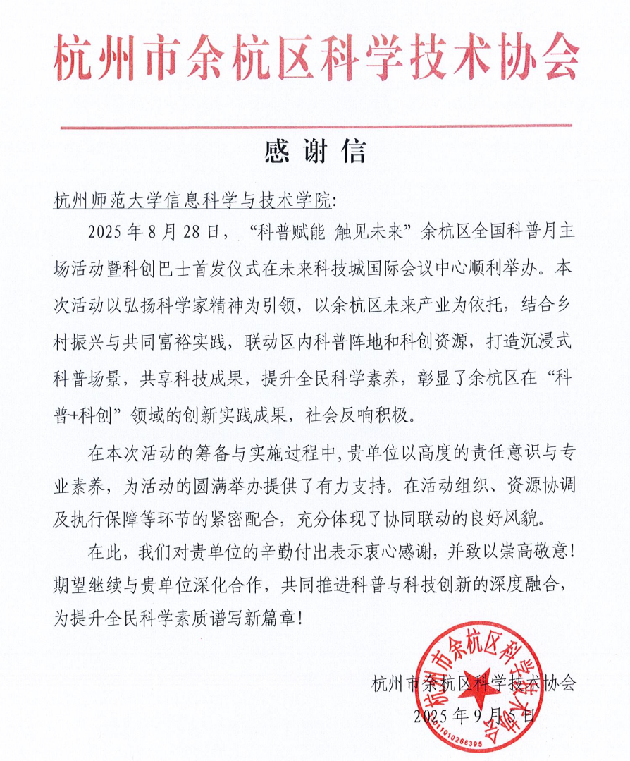 9月5日,换妻 收到杭州市余杭区科学技术协会发来的感谢信,信中对学院在“科普赋能 触见未来”余杭区全国科普月主场活动暨科创巴士首发仪式中的大力支持表示衷心感谢,并对参与师生的专业素养与协作精神给予高度评价。