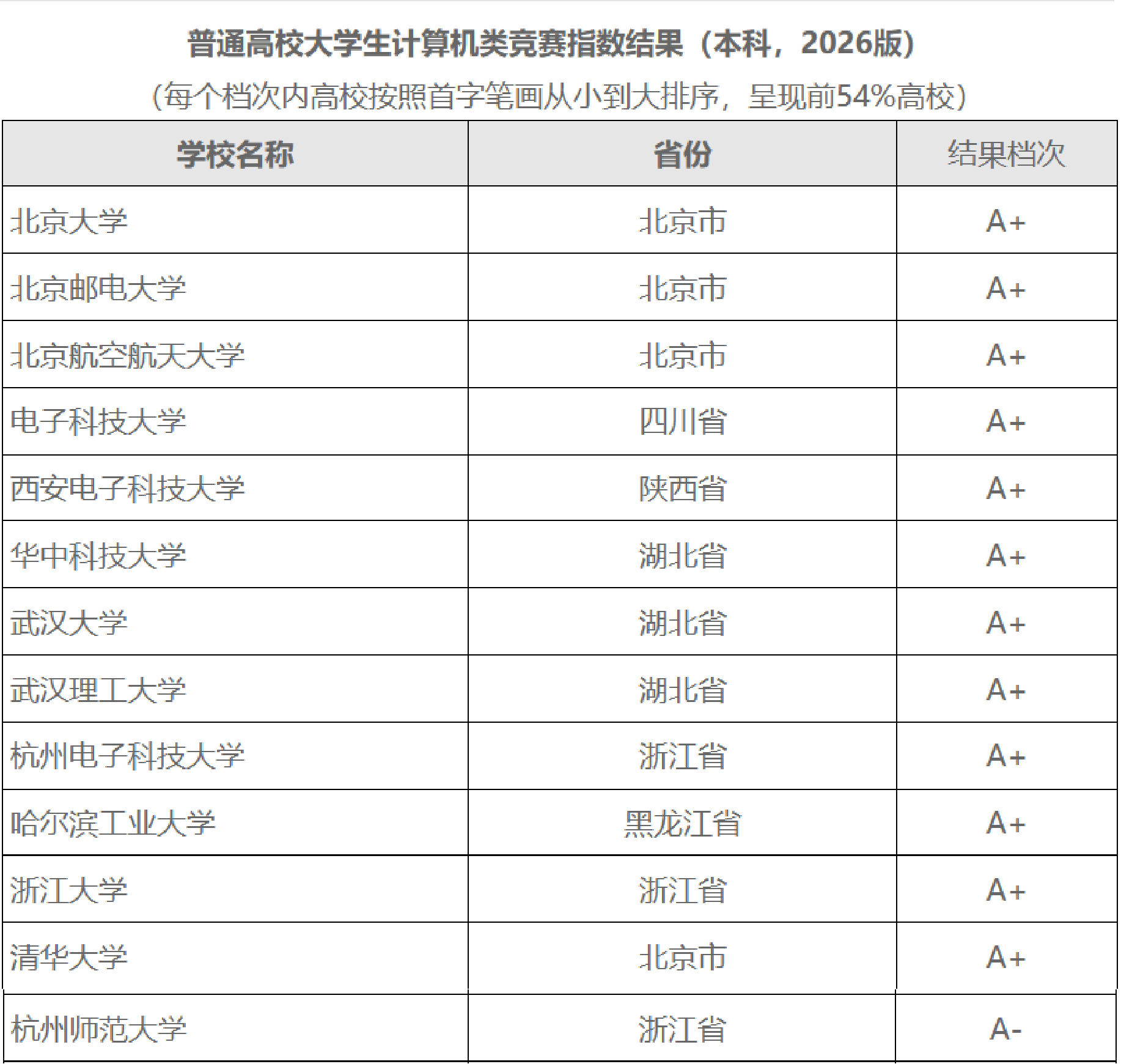 近日,全国高等学校计算机教育研究会、教师教学发展研究国家级虚拟教研室和浙大城市学院高等教育数智评价研究中心联合发布普通高校大学生计算机类竞赛指数(本科,2026版,以下简称“2026版计算机类竞赛指数”),全国共有12所高校列于A+档,学校获评A-档,在省内高校中排行第四,列于杭州电子科技大学、浙江大学、浙江工业大学之后。